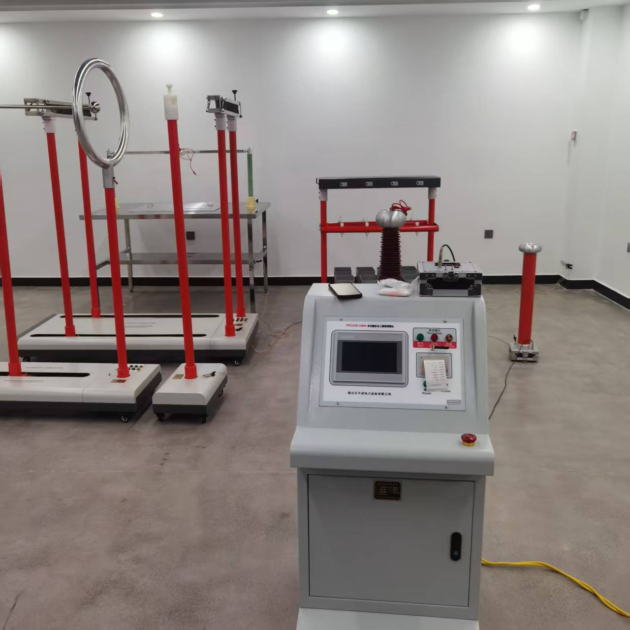 本次客戶那邊采購的我司一套絕緣安全工器具檢測裝置其主要包括:無線脫扣絕緣靴(手套)測試裝置、電動絕緣桿測試支架、電動驗電器、絕緣墊試驗電極。無線脫扣絕緣靴(手套)測試裝置主要是針對于絕緣靴、絕緣手套安全工器具進行智能化絕緣耐壓試驗,其可以支持多雙絕緣靴或絕緣手套的試驗,并測量每只試品的泄漏電流,采用里面放置小鋼珠的干式試驗方法,擺脫了傳統的往鞋子里灌水做試驗,試驗完畢后不易曬干的做法。電動絕緣桿測試支架,該測試裝置采用了電動自動移動形式,可以更加方便準確地對絕緣桿進行絕緣性能檢測,電動驗電器也是采用電動自動移動驗電棒,免去人為調整的麻煩度,且更安全。絕緣墊試驗電極是針對于絕緣墊進行絕緣檢測的,其采用鋁合金材料制作,絕緣墊可以放置在桌面上,通過電極施加電流來進行絕緣性檢測。