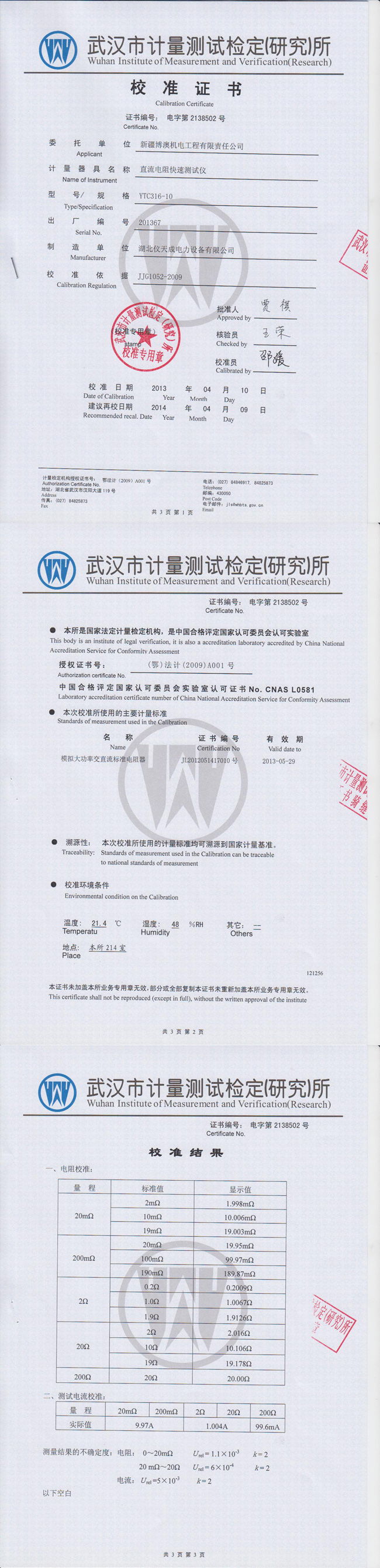 YTC316-10直流電阻測試儀資質證書